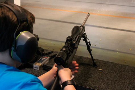 Молодой спортсмен выцеливает мишень из винтовки в закрытом тире.