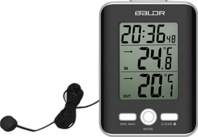 Термометр цифровой BALDR E0129ST2C с часами и проводным датчиком, черный