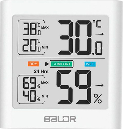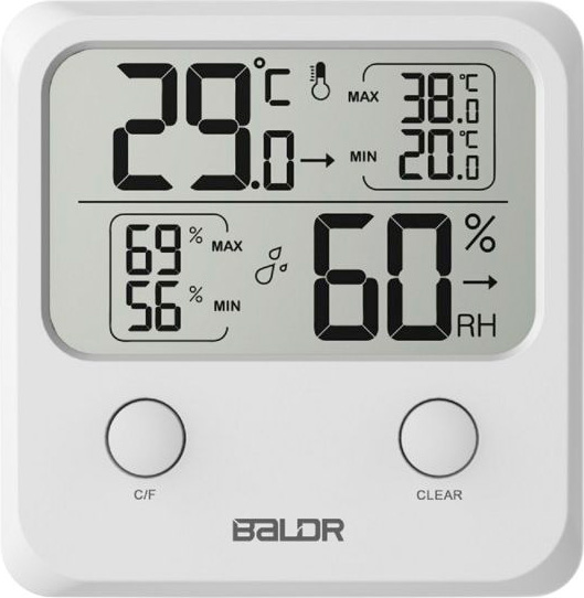 Компактный термогигрометр BALDR B0387TH гармонично вписывается в любой интерьер и дает возможность одним взглядом оценить температуру и влажность воздуха дома или в офисе. Крупный, легко читаемый ЖК‑экран показывает текущую температуру в диапазоне –10 °C…+50 °C (14 °F–122 °F) и относительную влажность в пределах 1–99%.