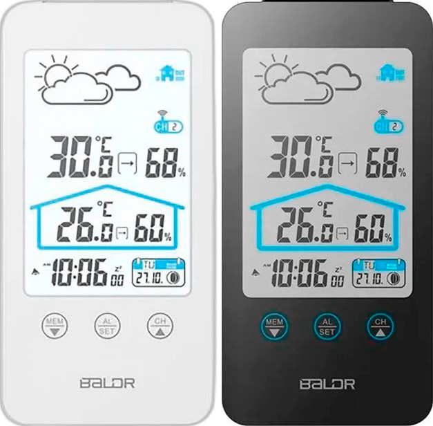 Метеостанция BALDR B0201WST2H2 имеет белый или черный (по выбору) эстетичный корпус и представляет собой компактный и наглядный центр домашней информации, который мгновенно показывает ключевые атмосферные параметры внутри и снаружи помещения, четко разделяя показания по зонам и исключая путаницу. Данные читаются с первого взгляда, поэтому вы сразу поймете, что происходит дома и за окном, не тратя время на расшифровку интерфейса.