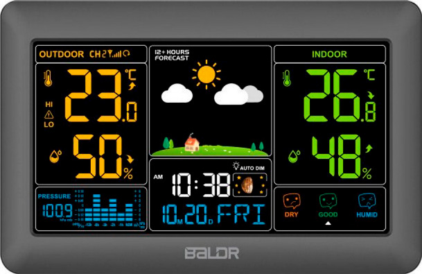 Метеостанция BALDR B0388WST2H2PR V4 Black сочетает в себе точный прогноз погоды с наглядной передачей данных и ориентирована на ежедневный контроль микроклимата и атмосферы за окном. Вместо набора разрозненных показаний вы получаете цельную картину: прибор отображает время и дату, внутреннюю и внешнюю температуру и влажность, индикатор комфорта, а также график атмосферного давления, позволяющий видеть общее направление изменений, а не только текущие значения.